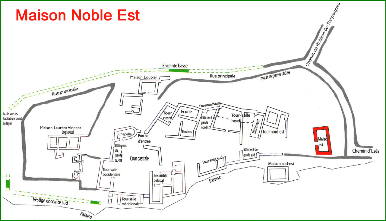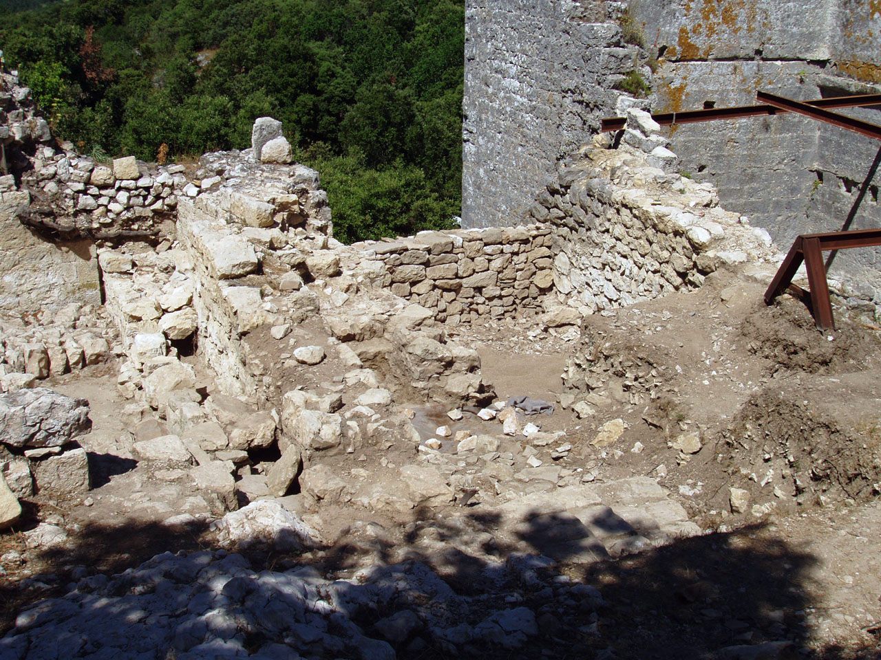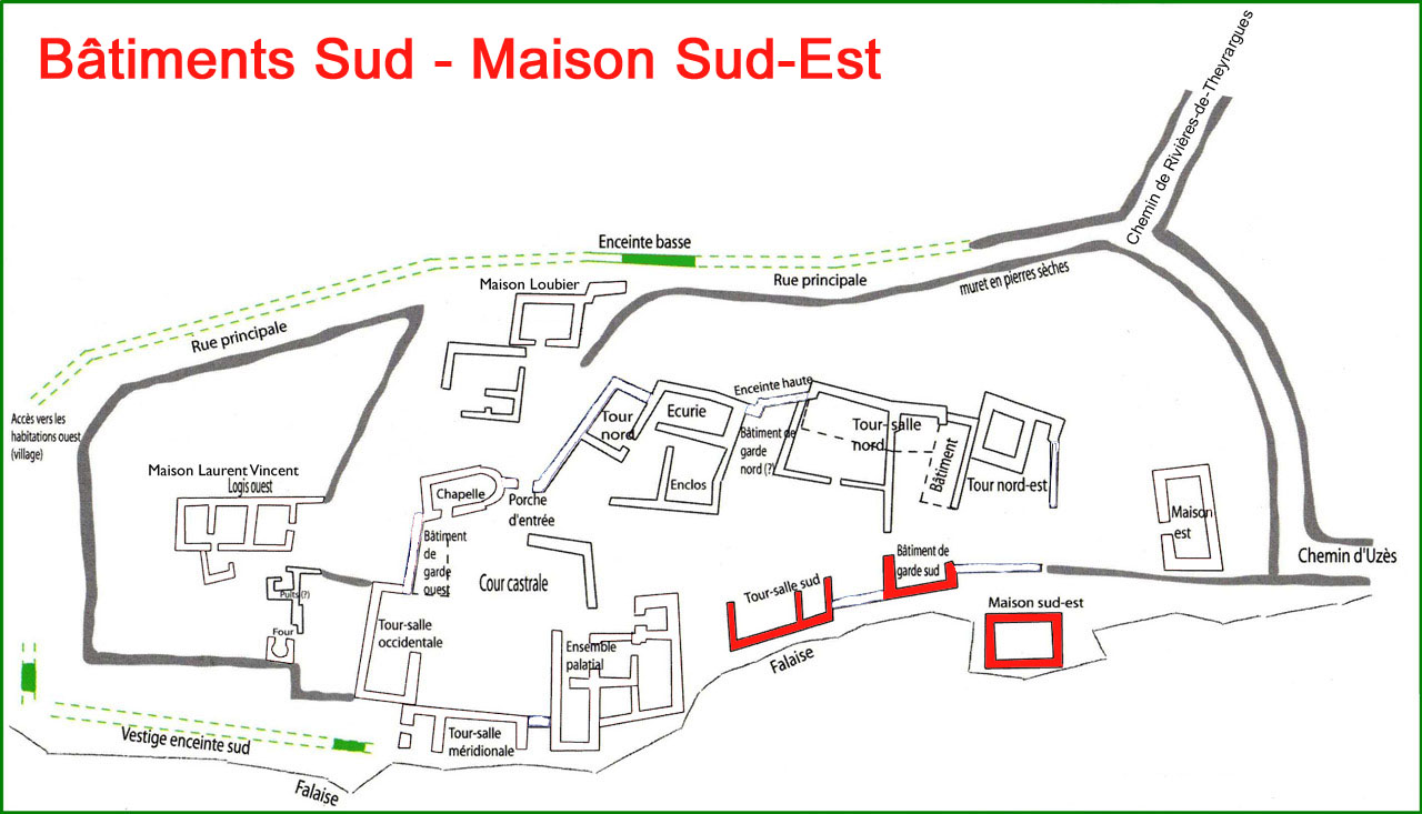 ⇑ En haut un pan de mur de la maison de garde, au premier plan vestiges de la Maison Sud-Est ⇑