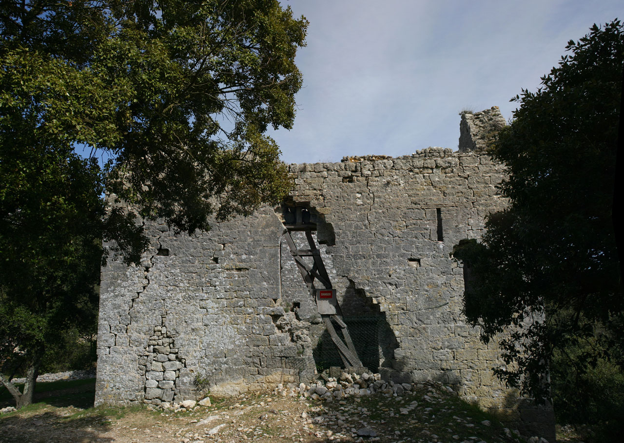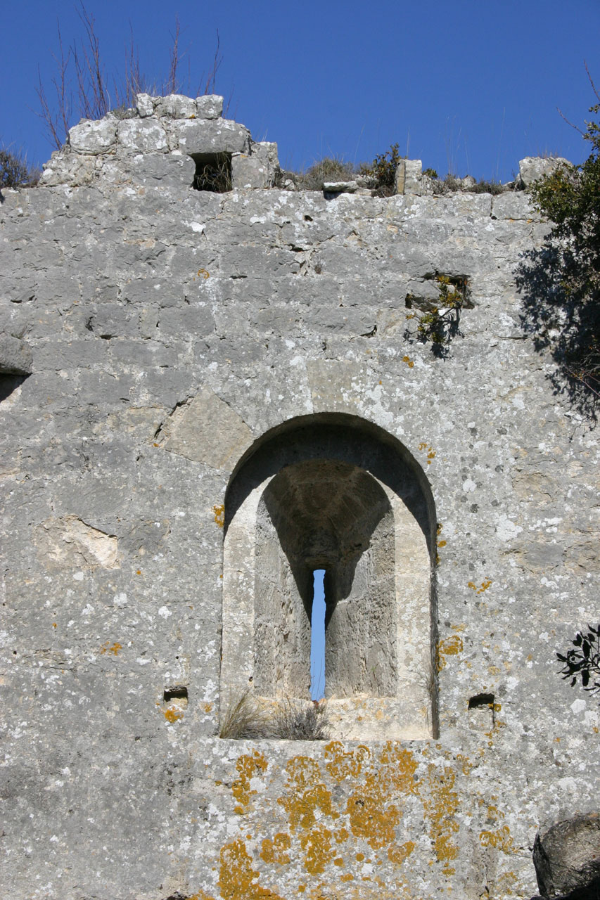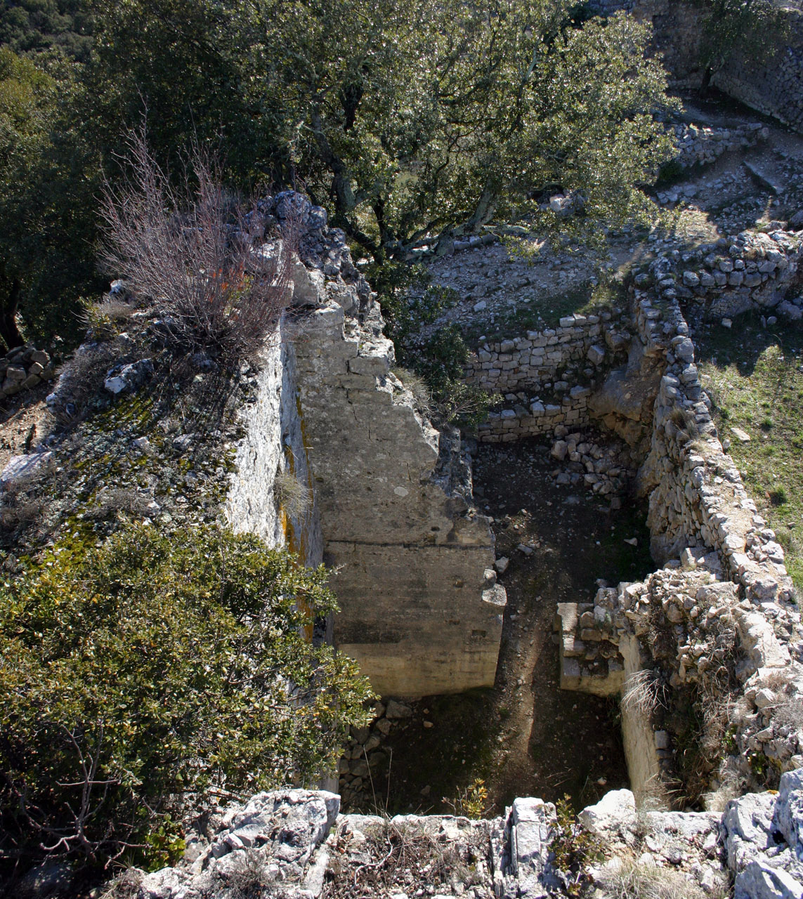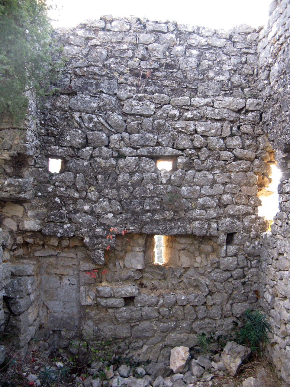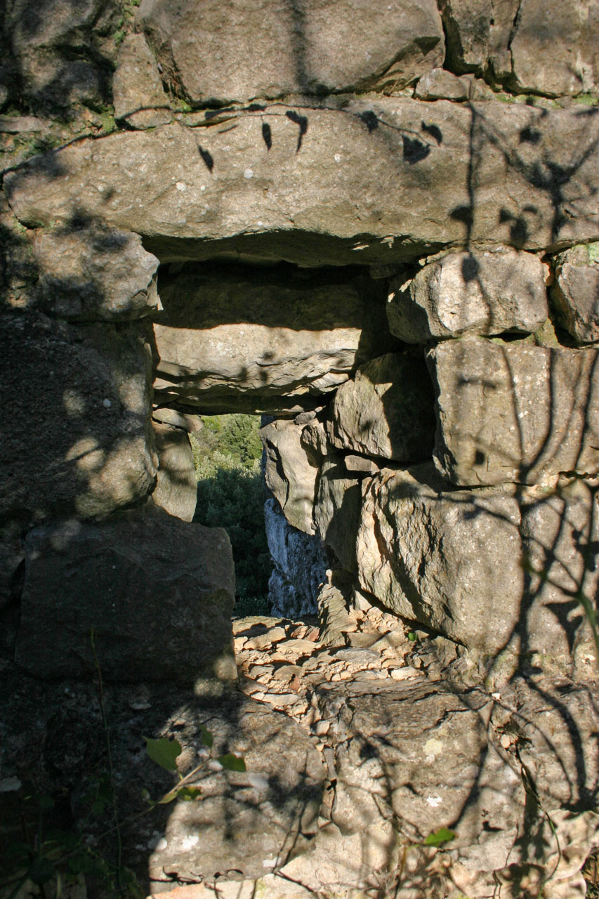 Sur cette photo on peut voir en bas à droite la porte rectangulaire donnant accès à l'huilerie (elle est bouchée par mesure de sécurité), en haut à gauche il s'agit de la petite fenêtre dont nous avons vu plus haut la face interne avec ses trois marches d'accès. L'ouverture centrale était peut-être similaire à la fenêtre de la face ouest, les belles pierres de taille ayant disparu depuis fort longtemps.