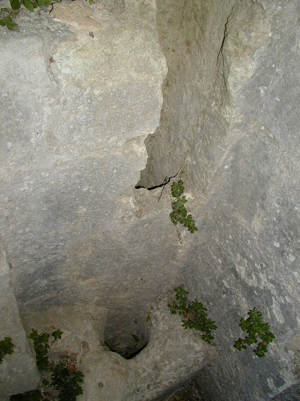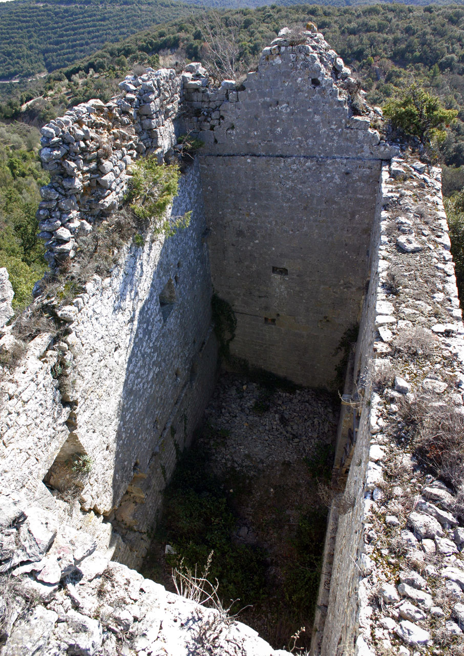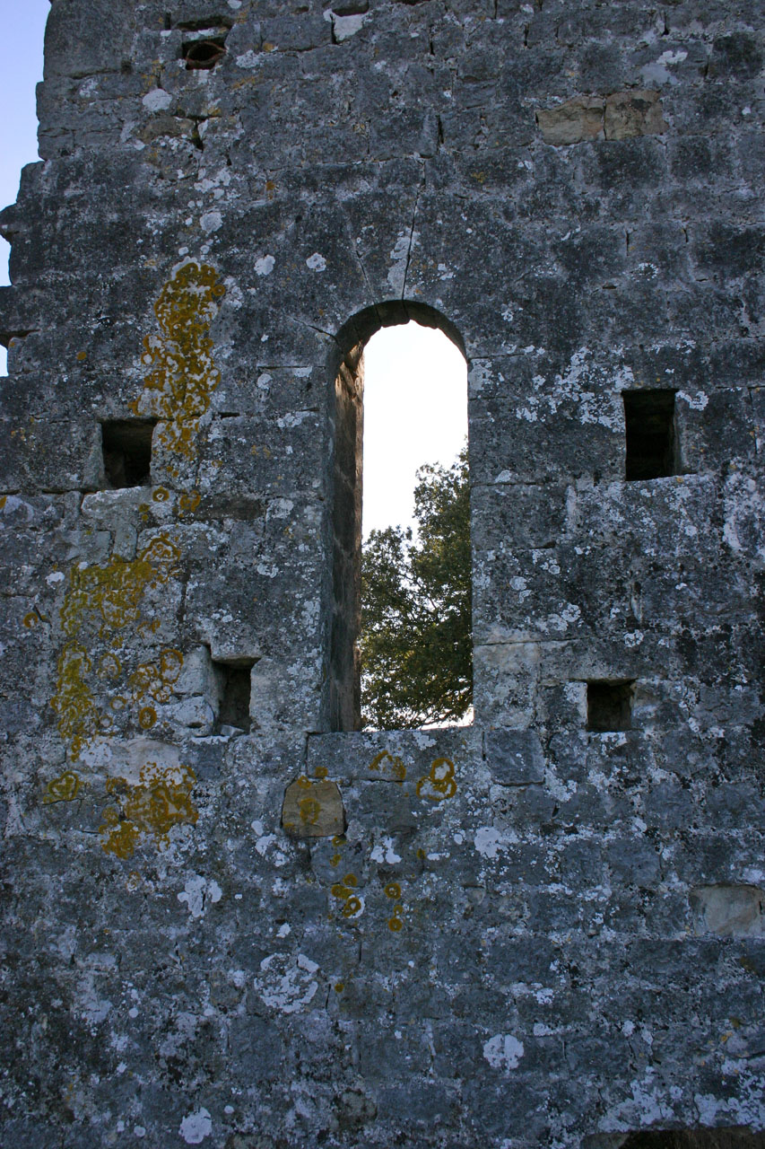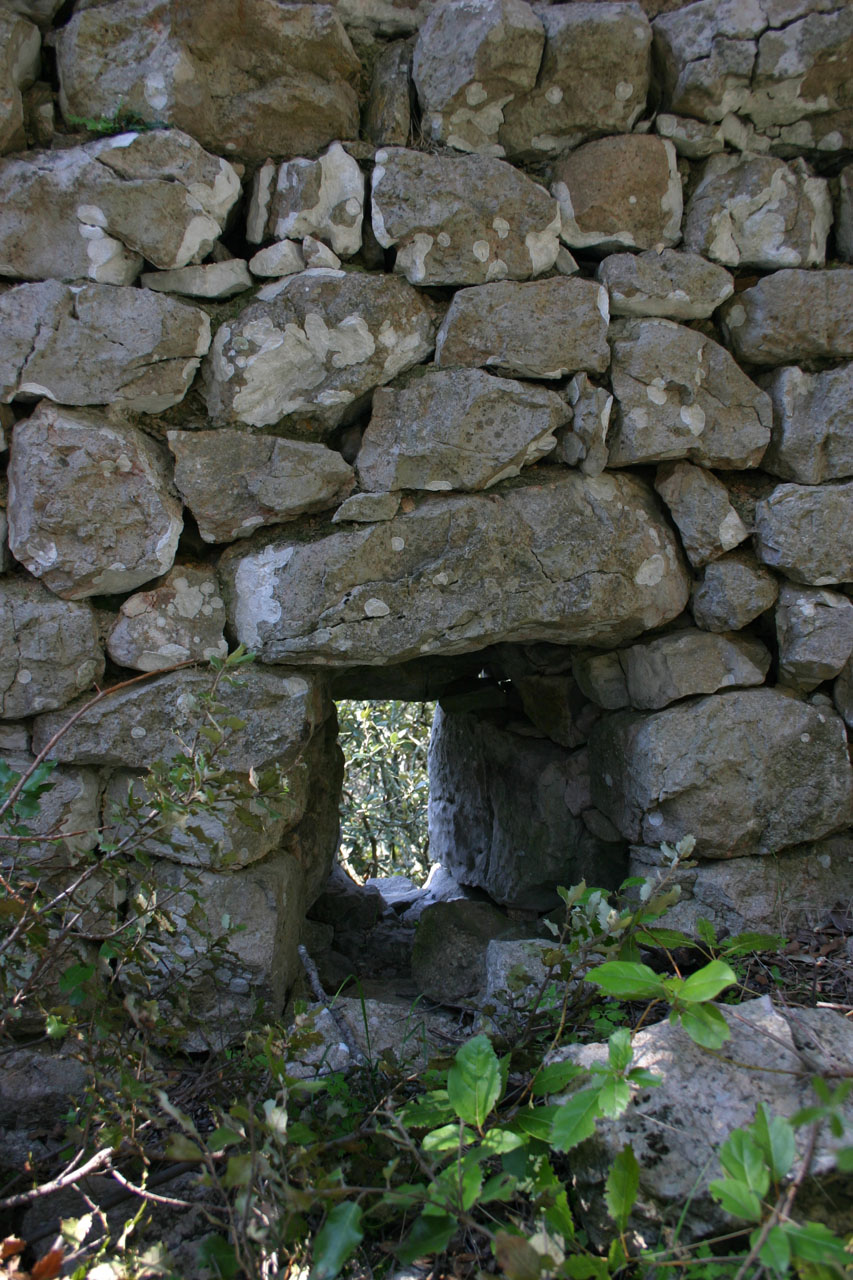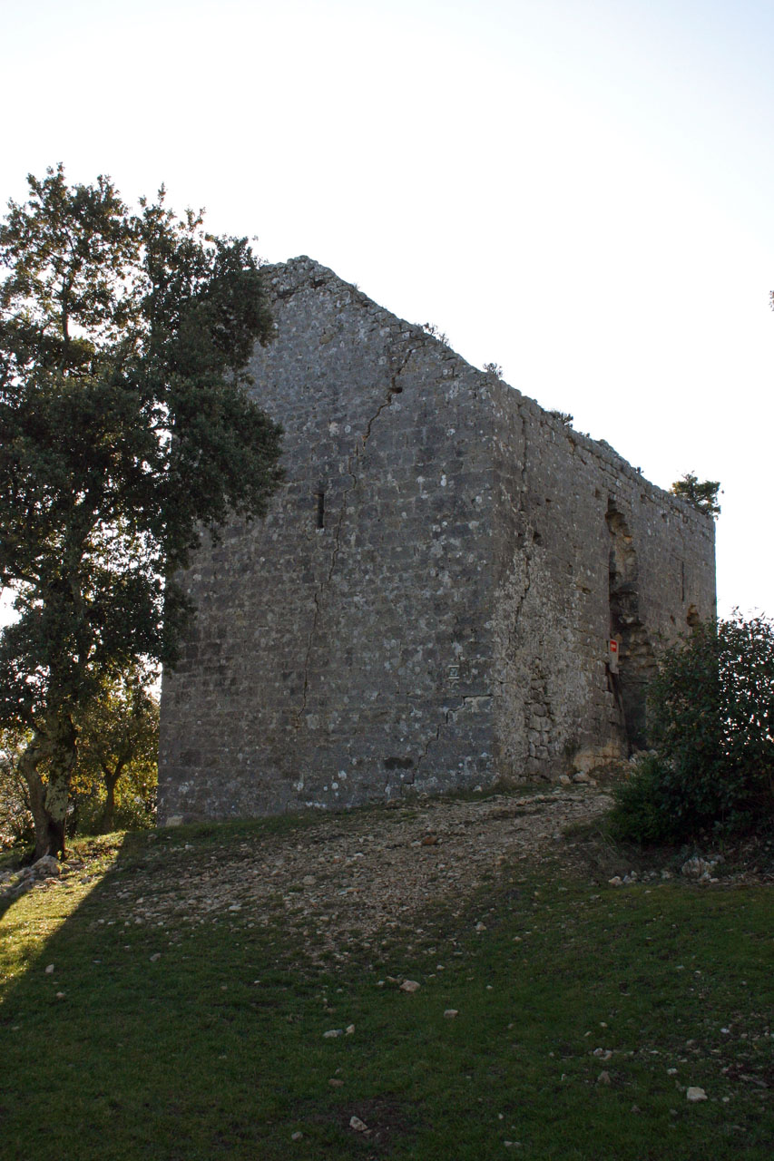 Sur cette photo on peut voir en bas à droite la porte rectangulaire donnant accès à l'huilerie (elle est bouchée par mesure de sécurité), en haut à gauche il s'agit de la petite fenêtre dont nous avons vu plus haut la face interne avec ses trois marches d'accès. L'ouverture centrale était peut-être similaire à la fenêtre de la face ouest, les belles pierres de taille ayant disparu depuis fort longtemps.