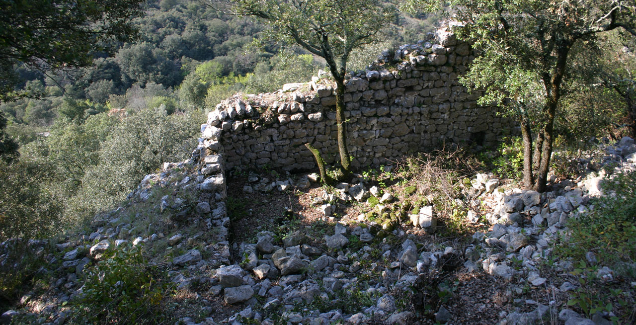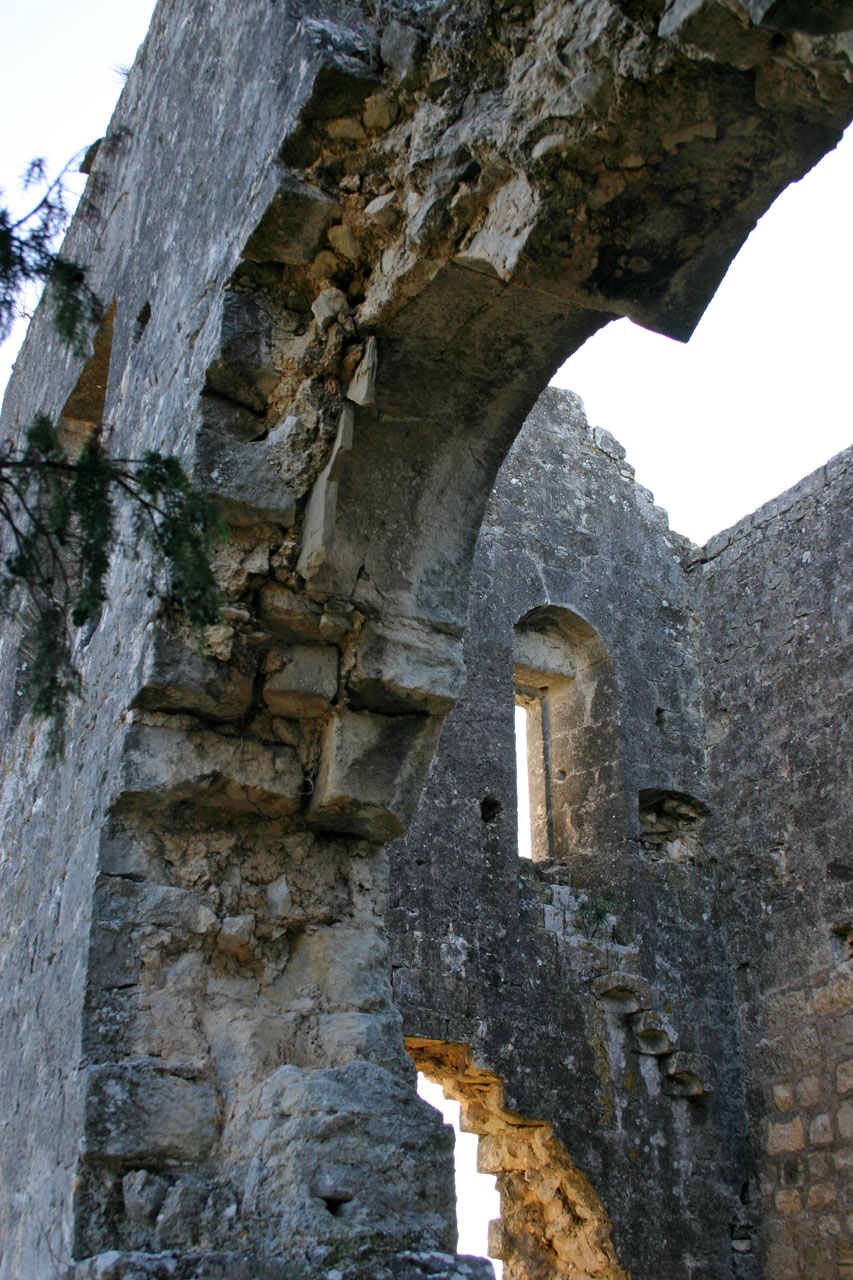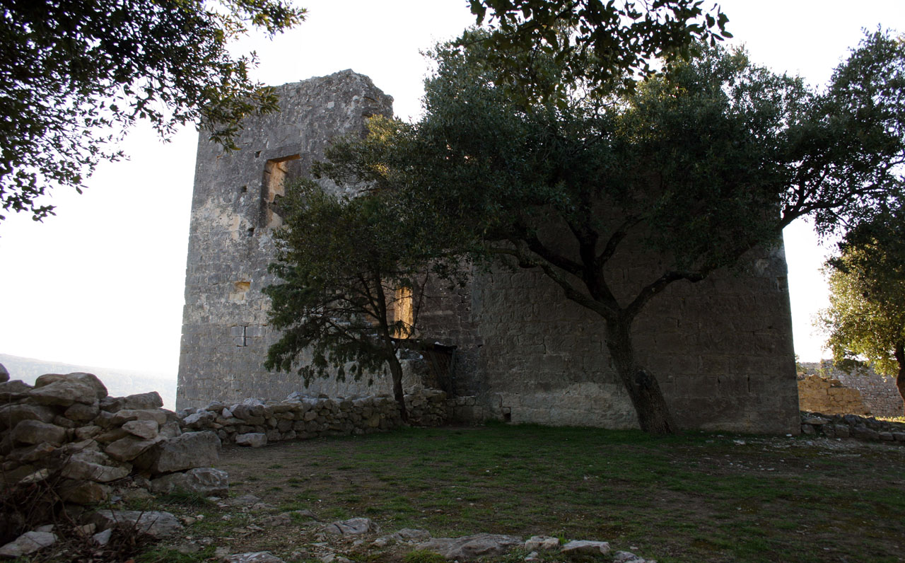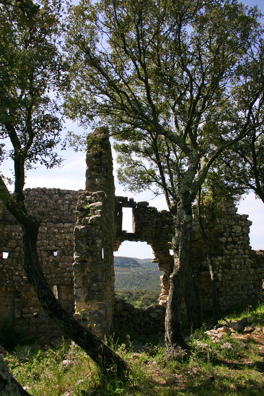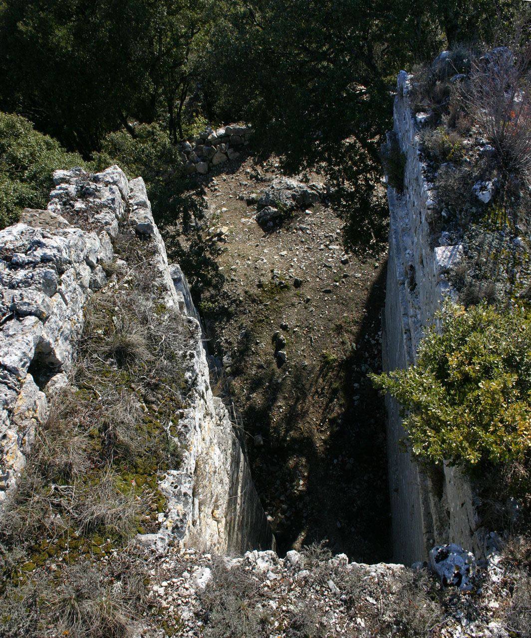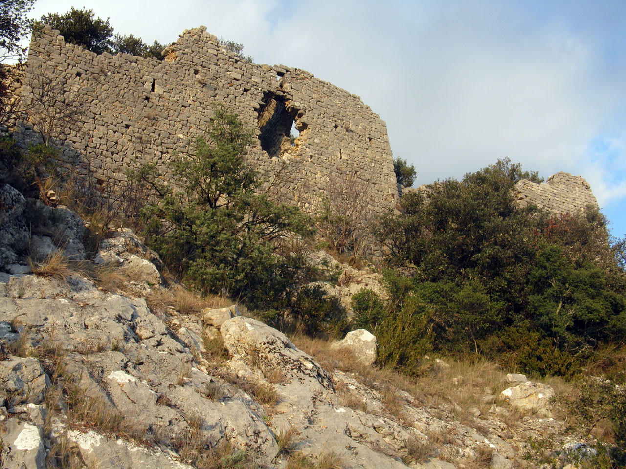 Sur cette photo on peut voir en bas à droite la porte rectangulaire donnant accès à l'huilerie (elle est bouchée par mesure de sécurité), en haut à gauche il s'agit de la petite fenêtre dont nous avons vu plus haut la face interne avec ses trois marches d'accès. L'ouverture centrale était peut-être similaire à la fenêtre de la face ouest, les belles pierres de taille ayant disparu depuis fort longtemps.