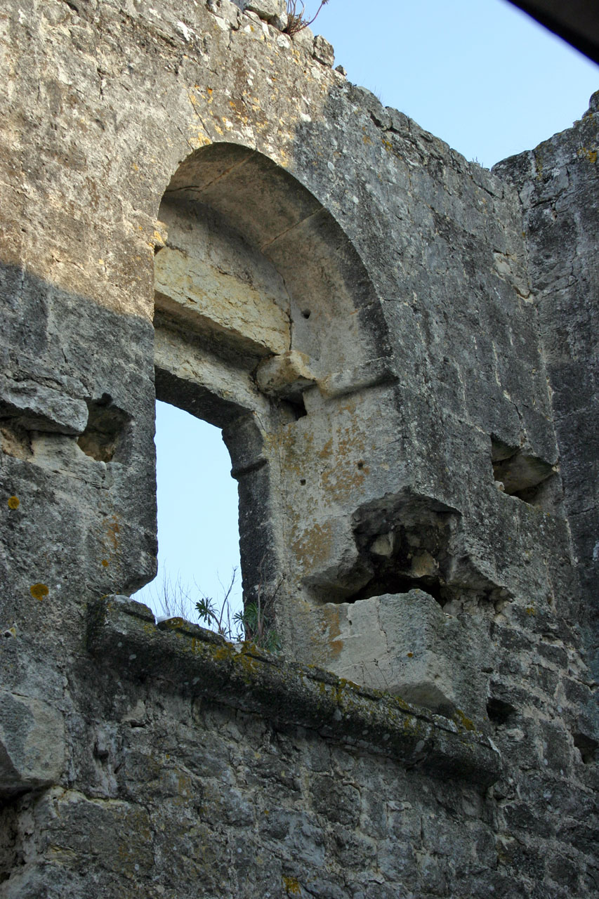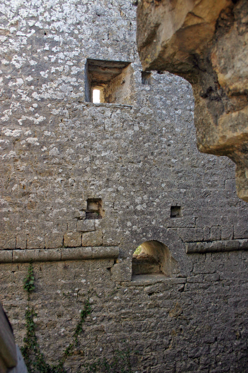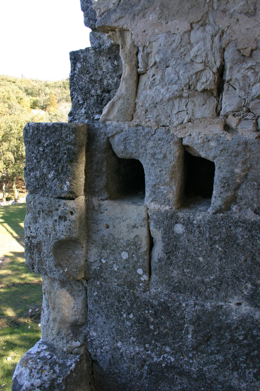 ⇑ Cette fenêtre est en fait une porte qui donnait sur un balcon en bois comme l'atteste la présence de quatre "trous de boulins" dans lesquels étaient fixés les poutres du dispositif en encorbellement.