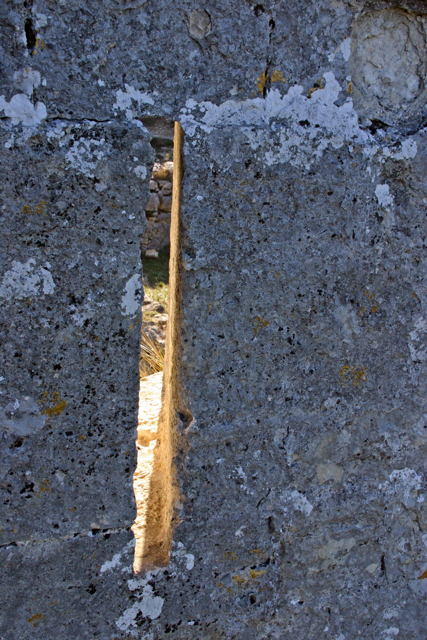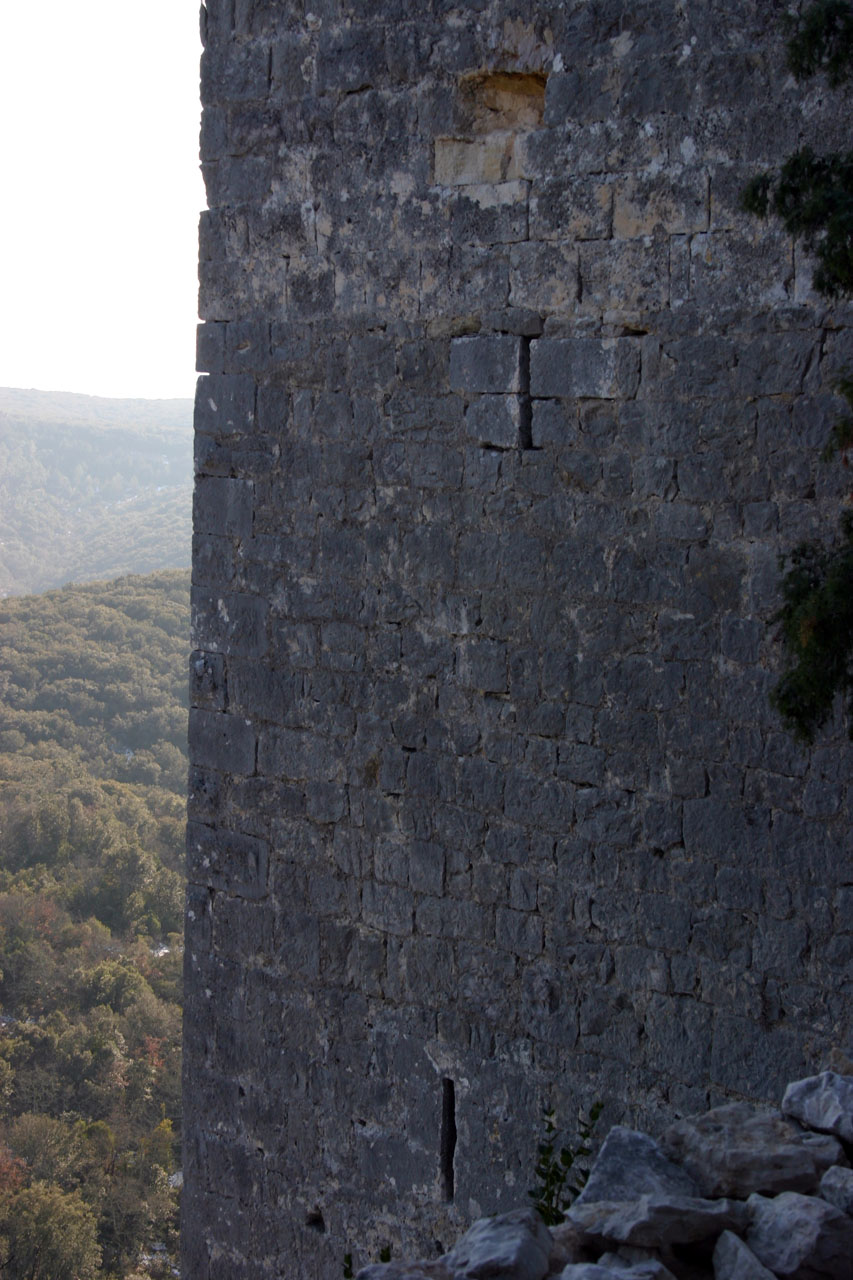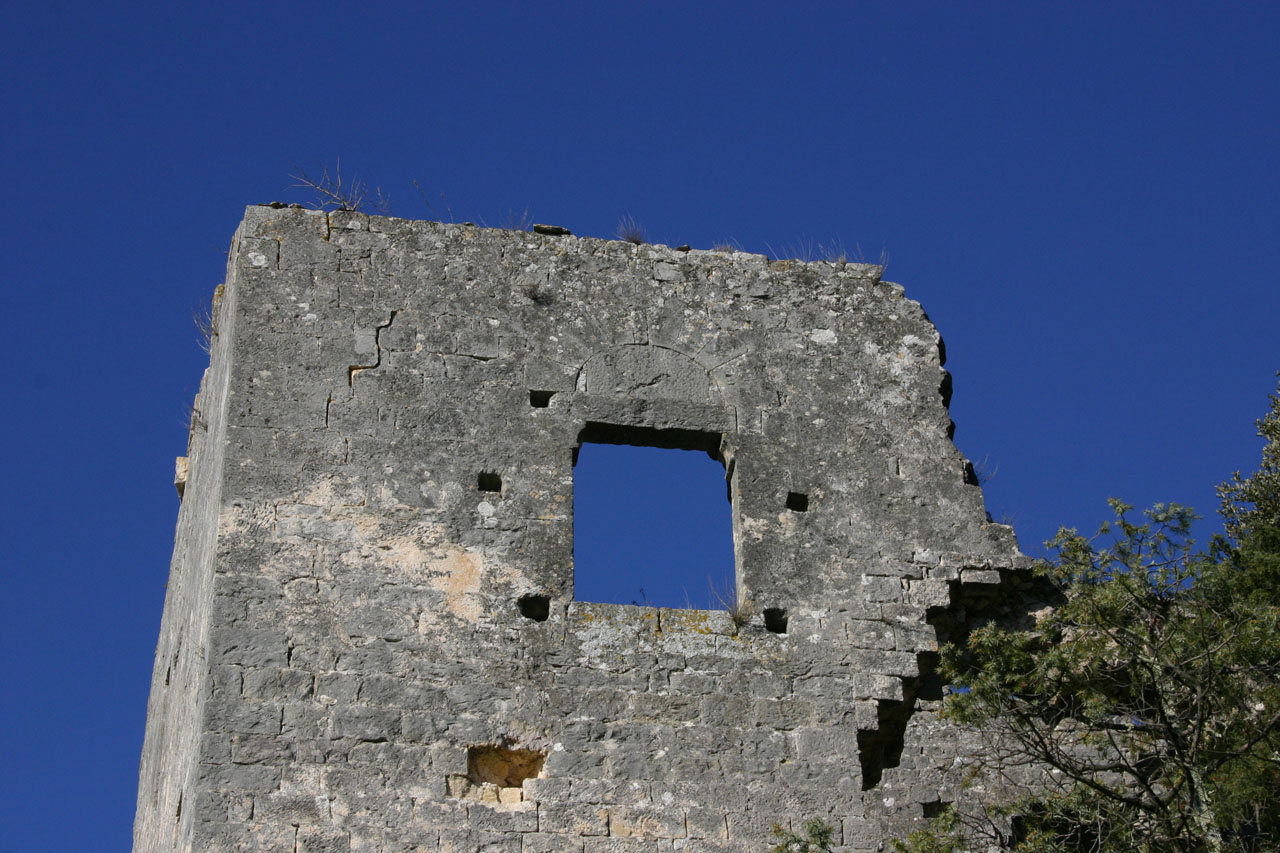 ⇑ Cette fenêtre est en fait une porte qui donnait sur un balcon en bois comme l'atteste la présence de quatre "trous de boulins" dans lesquels étaient fixés les poutres du dispositif en encorbellement.
