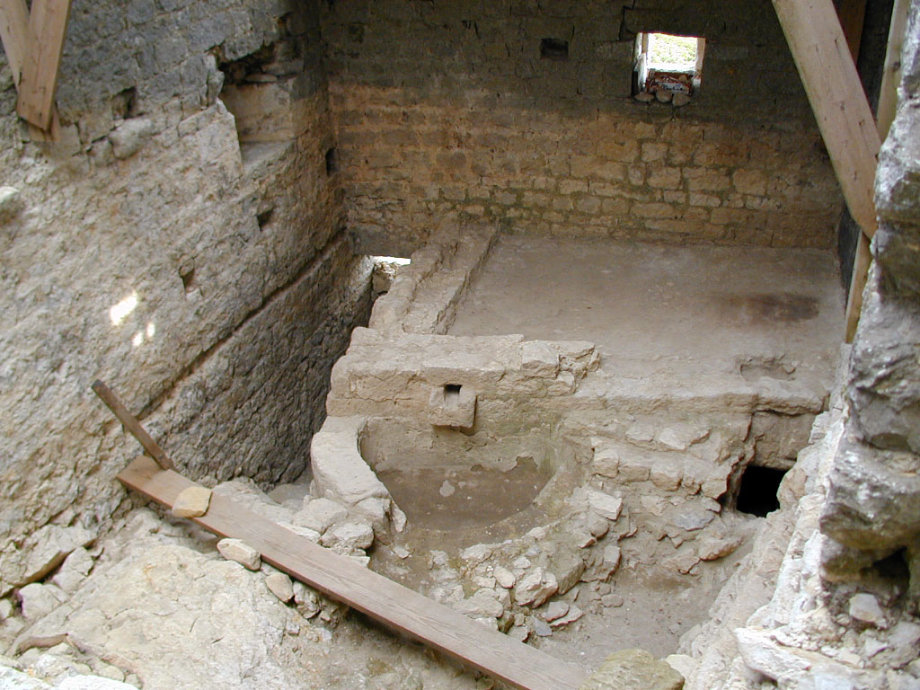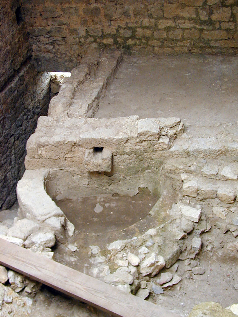 ⇑ Lors de fouilles effectuées en 2004, furent mis à jour le sol orignal de la salle ainsi qu'un système d'évacuation d'eau.