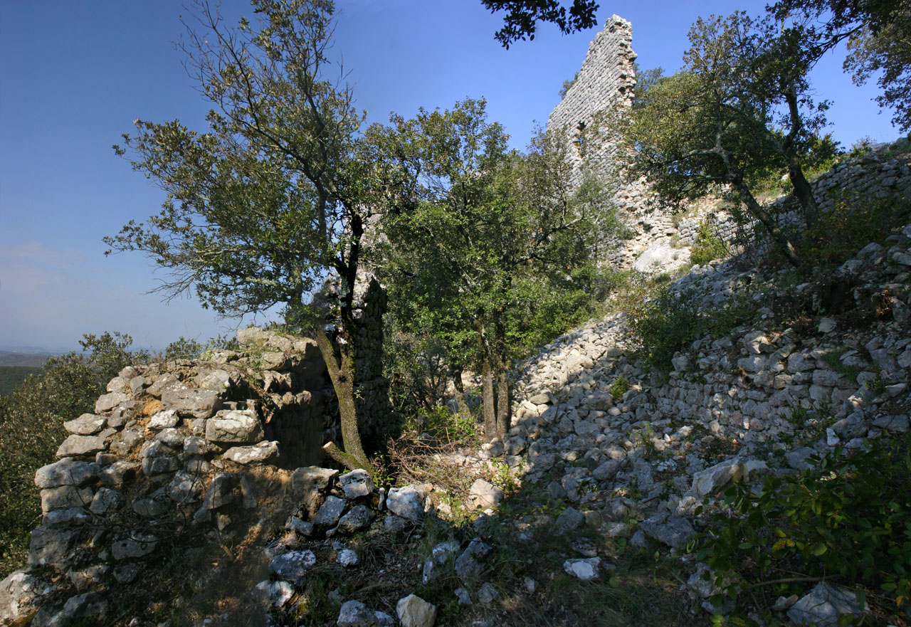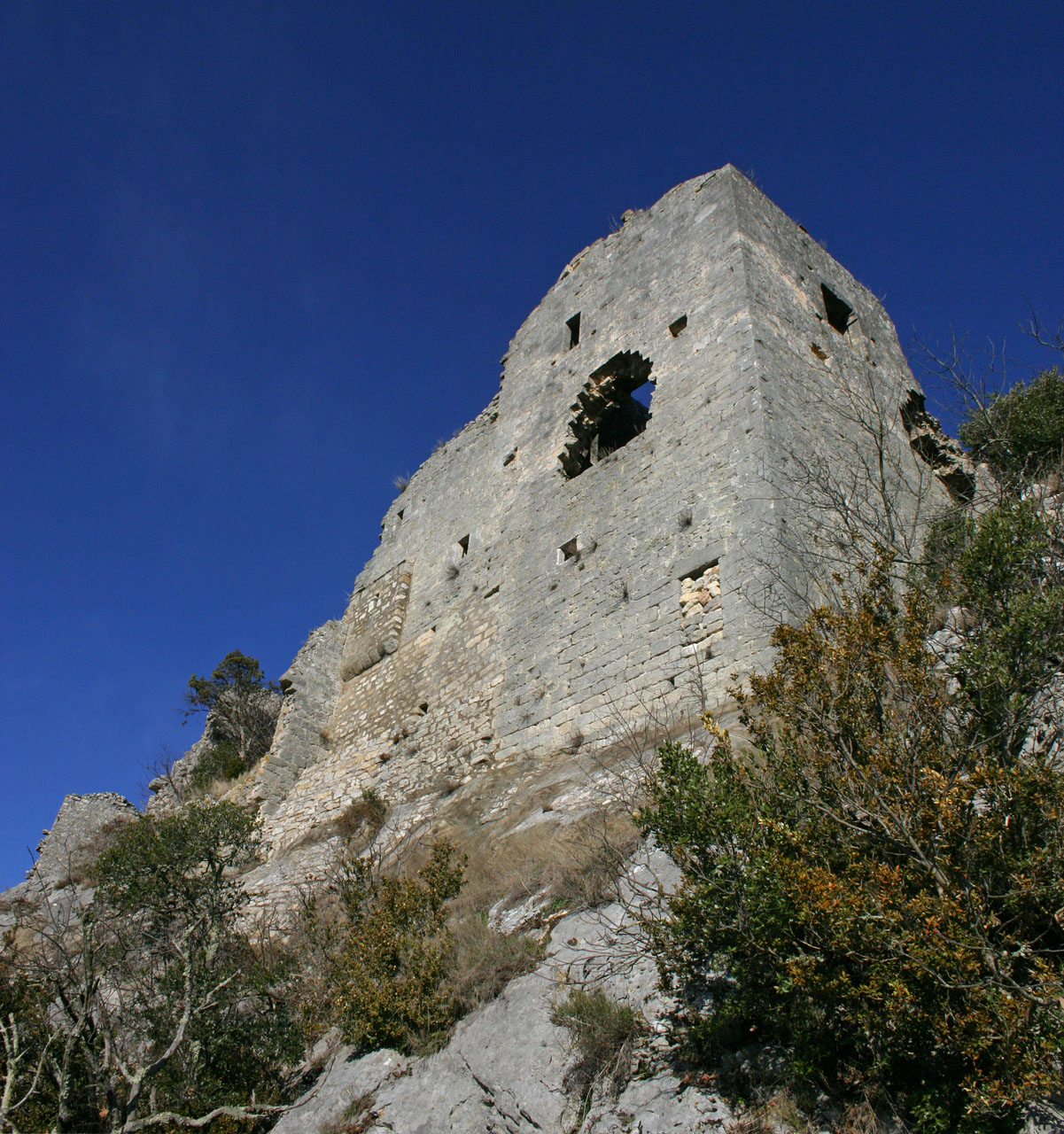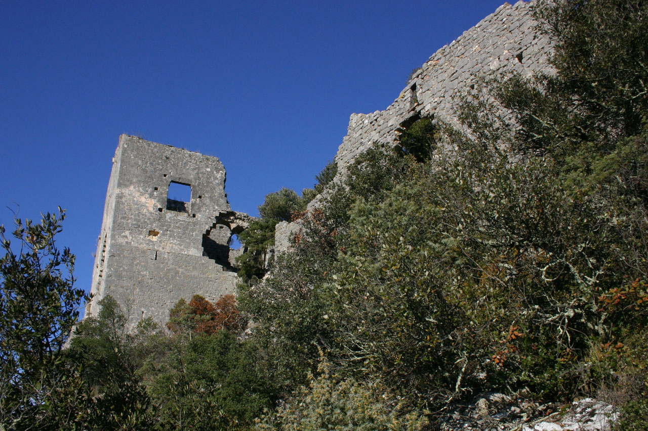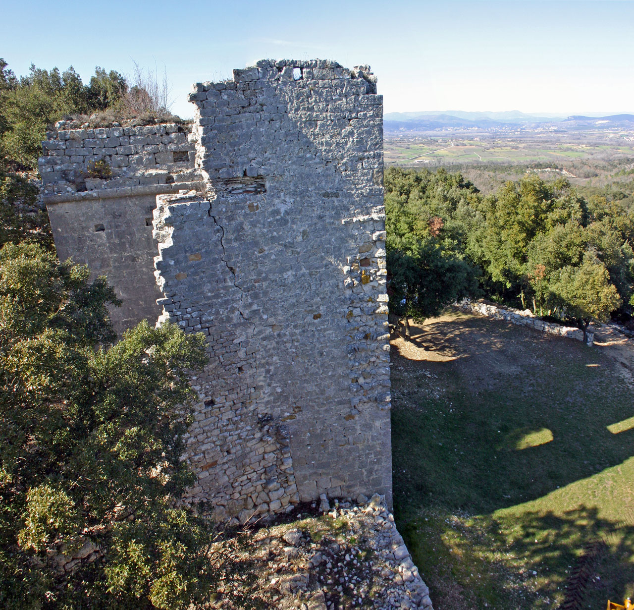 ⇐ Cette vue en contre-plongée d'un angle de la bâtisse permet d'apprécier la qualité des constructions du XIIème siècle.