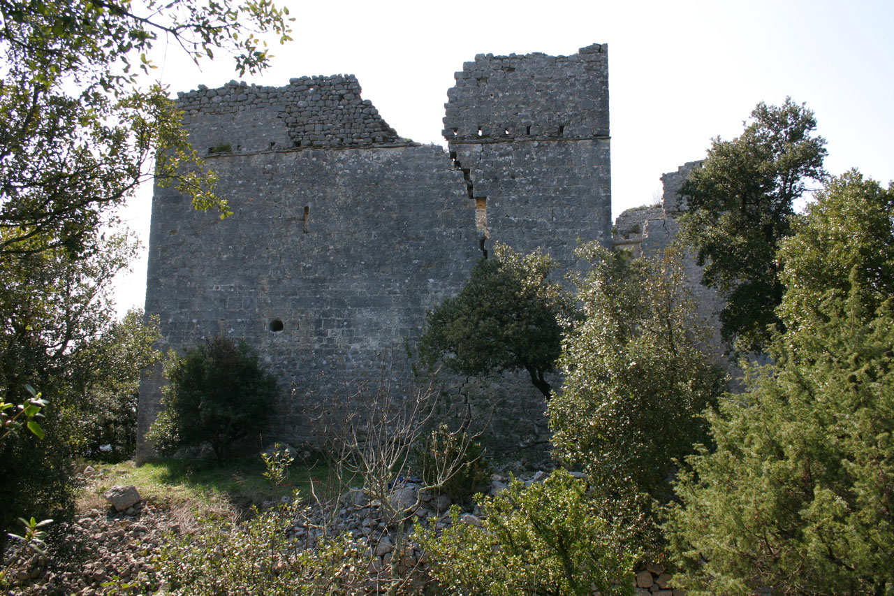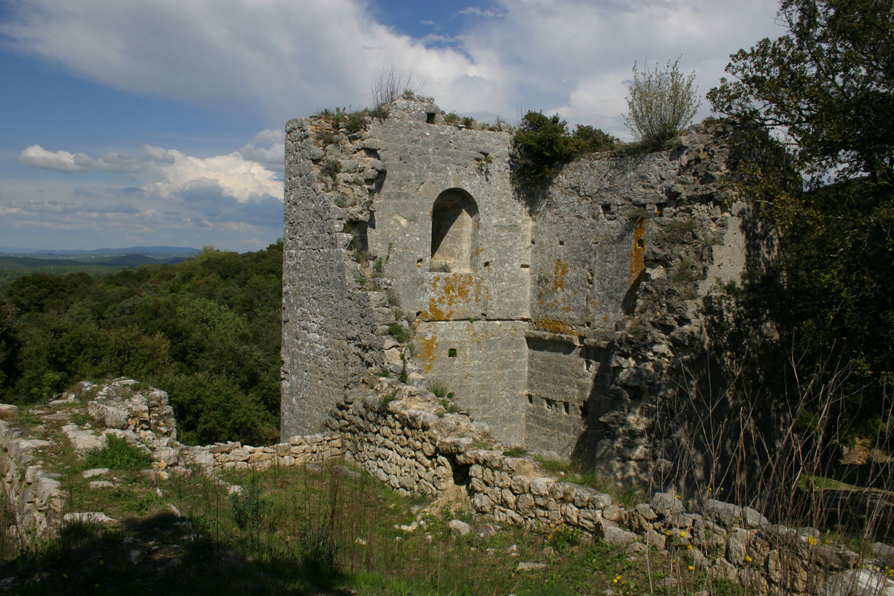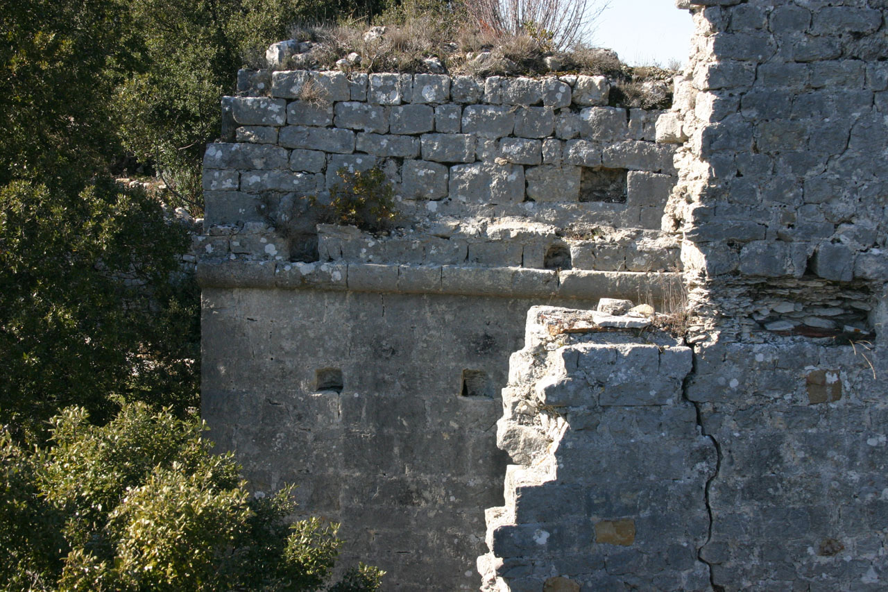 ⇑ Ce bâtiment est quasi aveugle sur trois de ses faces (sud, est et nord); le mur est, parallèle à l'arrivée du chemin Royal venant d'Uzès, comporte toutefois deux petites ouvertures semi circulaires surmontées de deux meurtrières verticales.