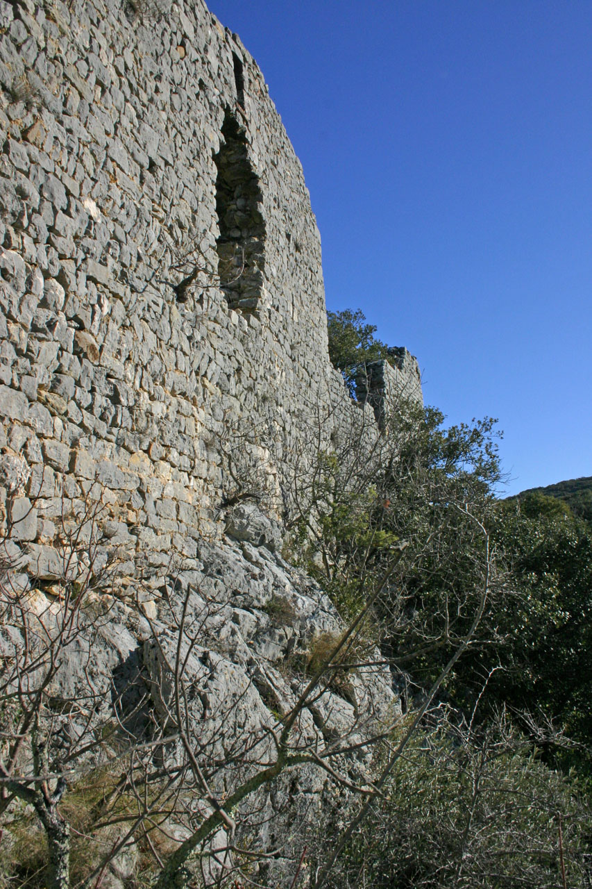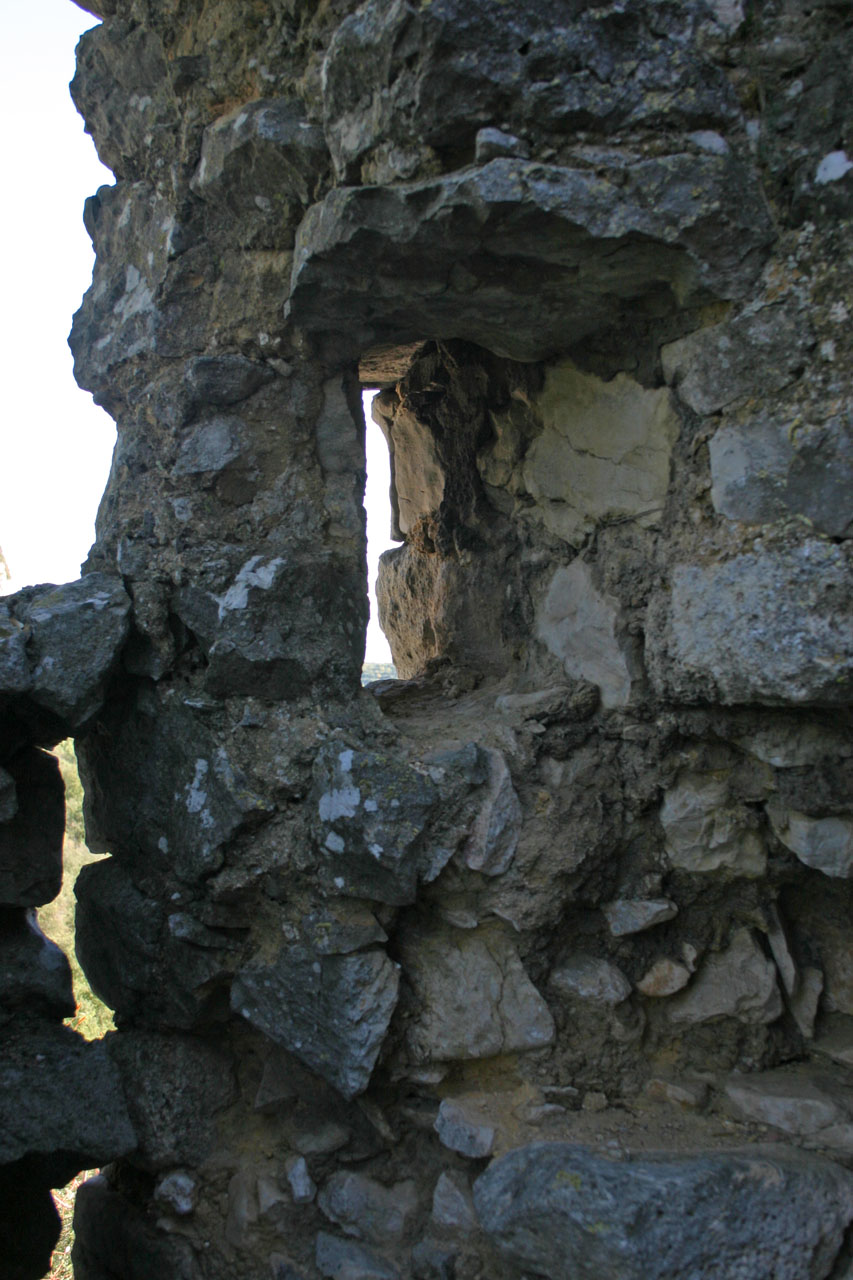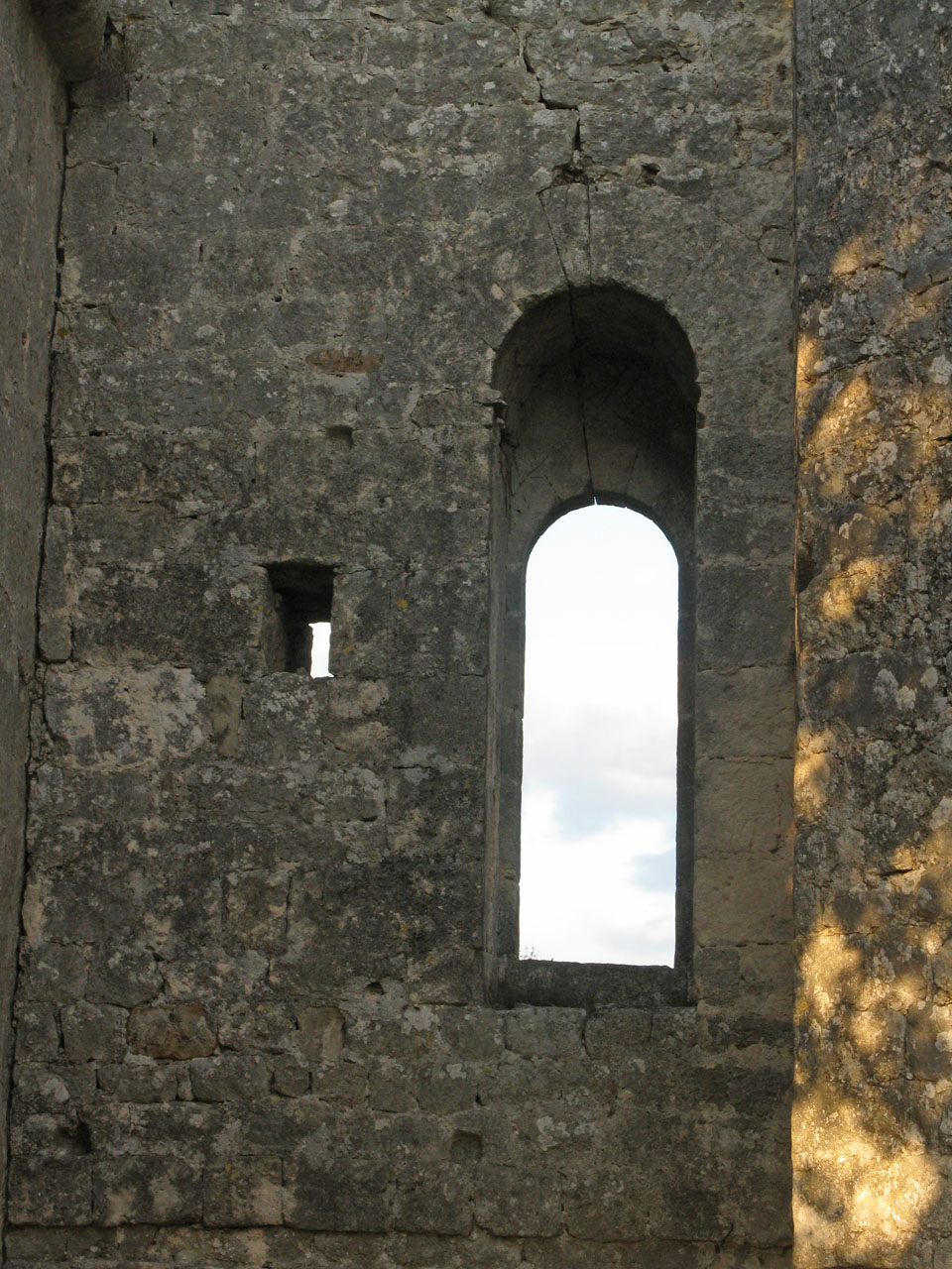 A part un trou informe et béant témoin d'une belle fenêtre dont l'encadrement a été pillé lorsque le château s'est trouvé à l'abandon, cette façade présente peu d'ouvertures: deux meurtrières de part et d'autre du mur et une fenêtre rectangulaire éclairent les salles qui se trouvaient derrière.