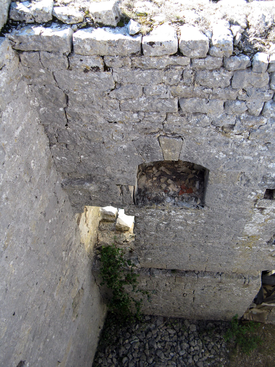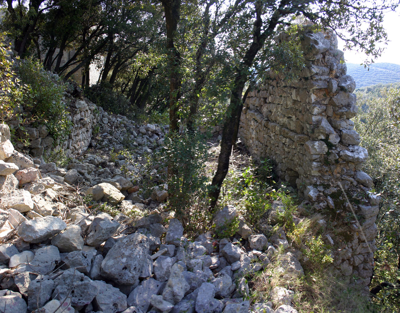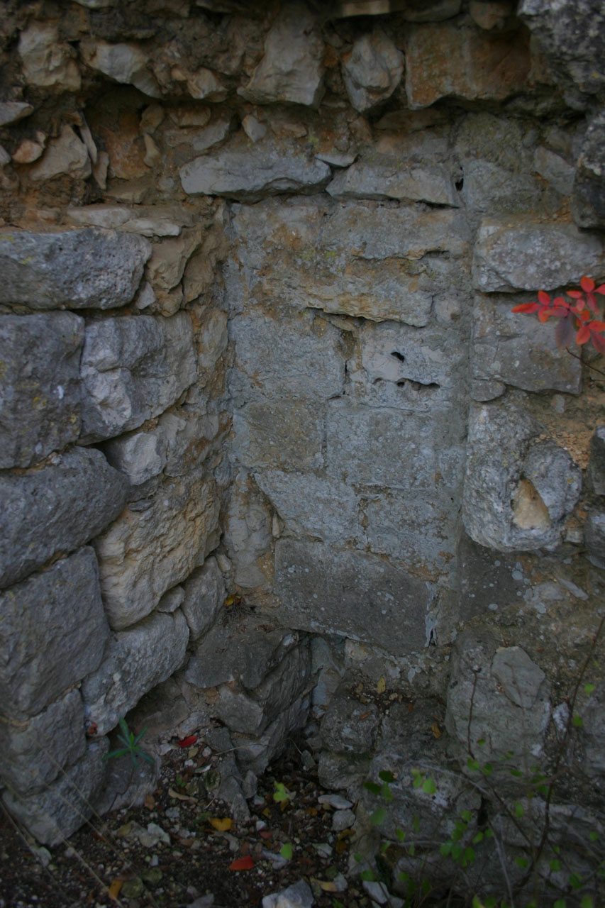 ⇑ On voit ici que le mur présente un décrochement sur lequel reposait un plancher, la pièce inférieure est presque totalement comblée par les ruines de la maison mais on aperçoit tout de même le haut d'une fenêtre.