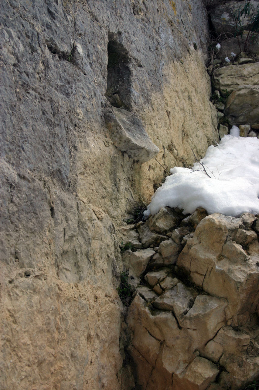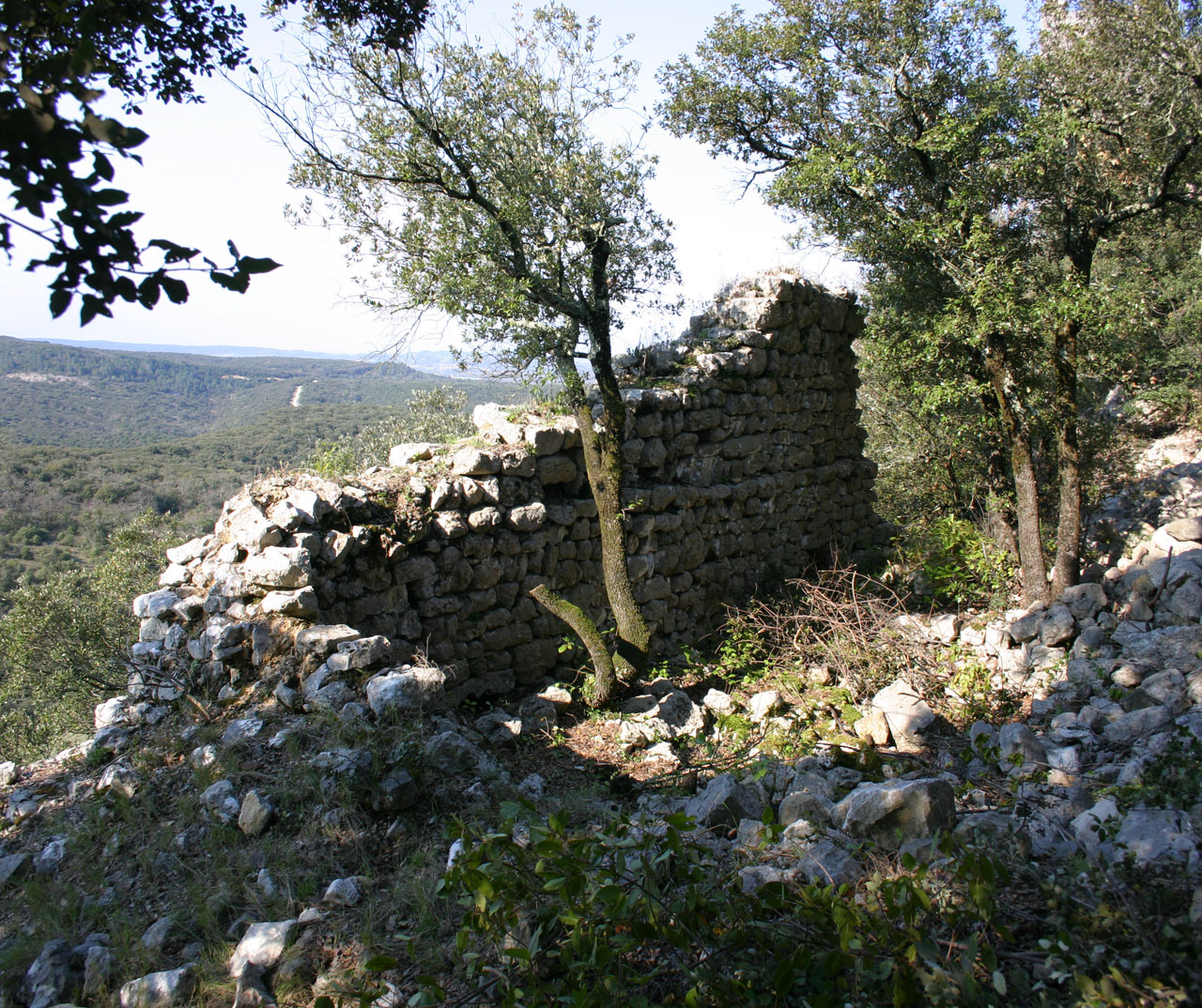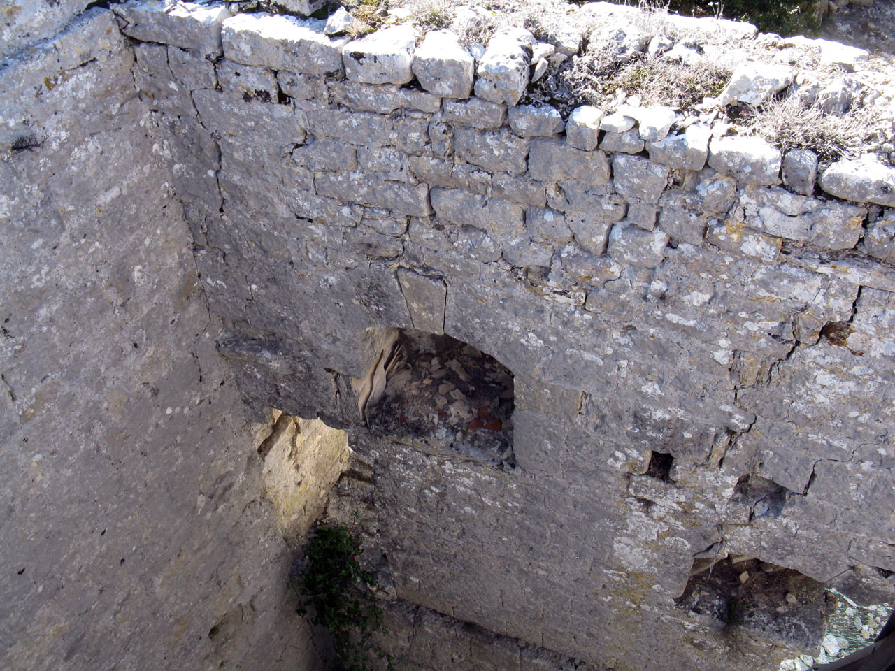 ⇑ On voit ici que le mur présente un décrochement sur lequel reposait un plancher, la pièce inférieure est presque totalement comblée par les ruines de la maison mais on aperçoit tout de même le haut d'une fenêtre.