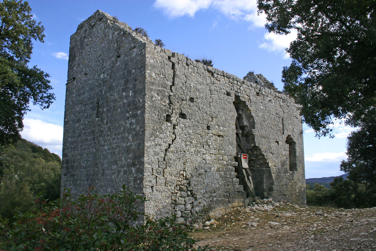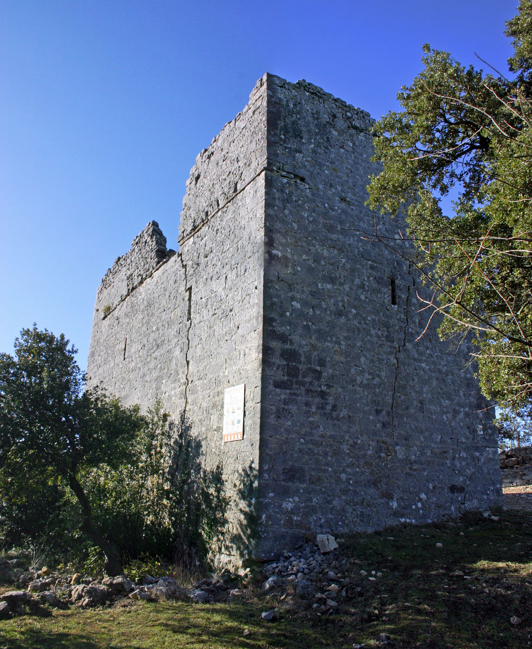 ⇑ La réalisation de ce bâtiment du XIIème siècle se limite à quatre murs périphériques, l'étage intérieur étant constitué d'un plancher reposant sur deux moulures semi-circulaires que l'on aperçoit à mi-hauteur des deux grands murs, le tout était surmonté d'une toiture à double pente en " Lauzes " calcaires.