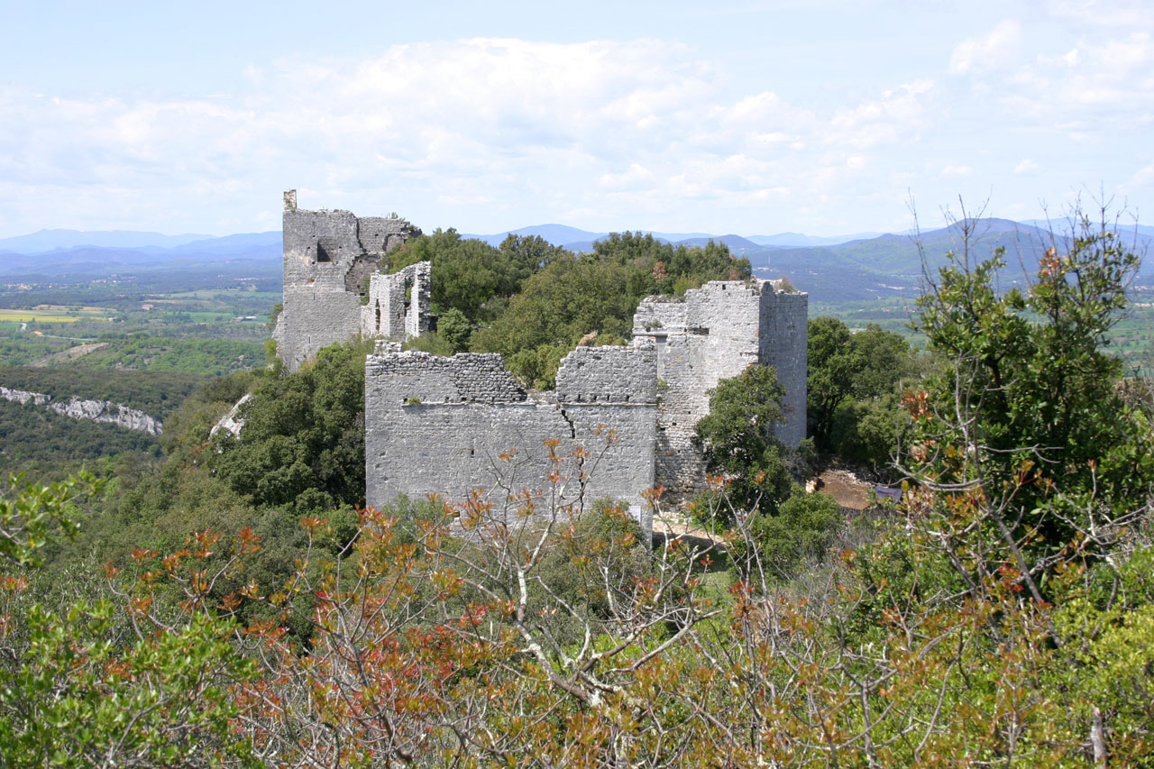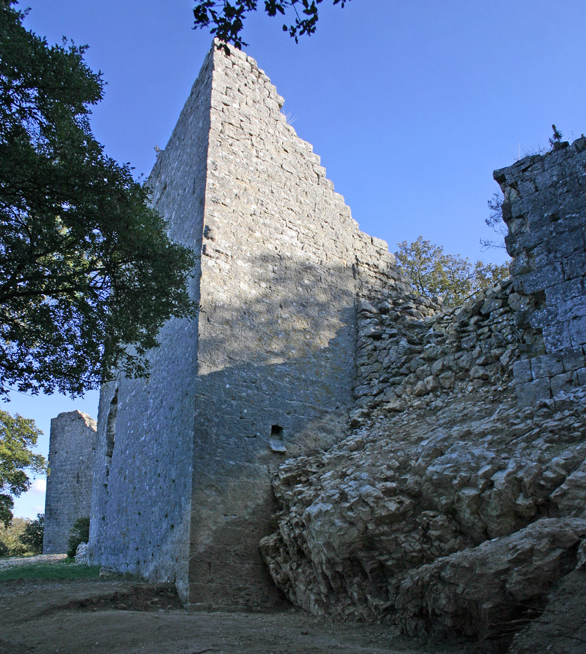 ⇑ Quand on aborde le Château par le pré Nord, la partie visible de cet ensemble est imposant pourtant il ne s'agit que de la Tour Nord-Est; le Bâtiment Nord, situé derrière l'arbre à droite de la photo, ne possède plus que ses soubassements.