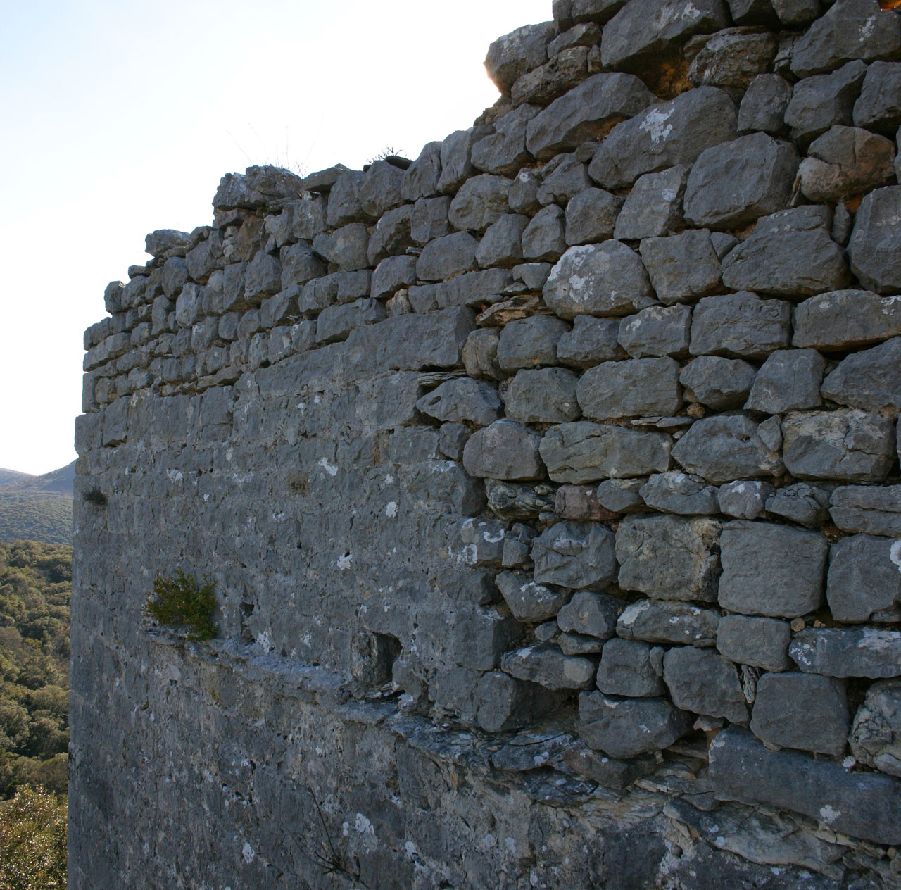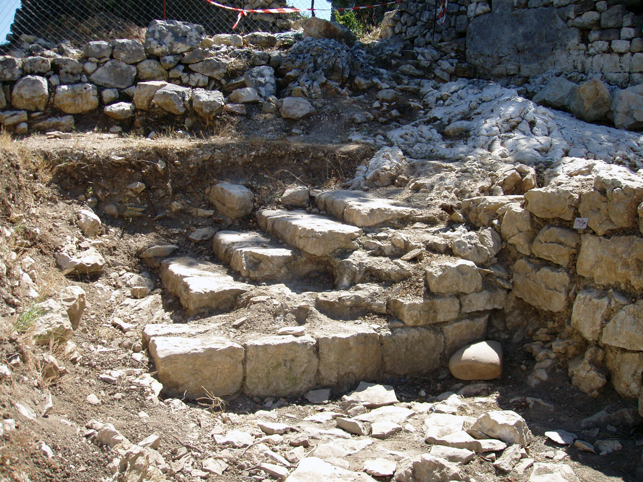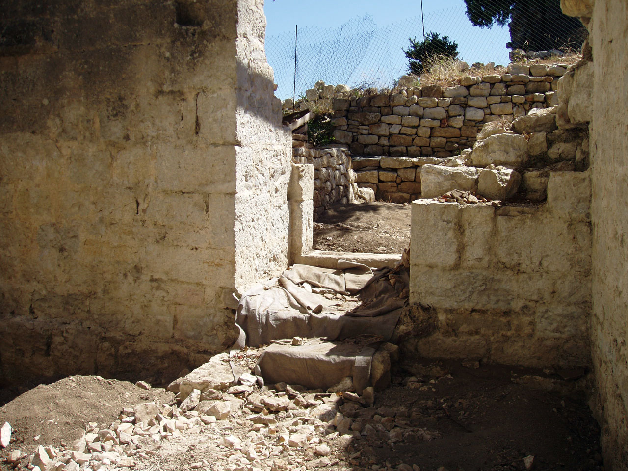 A gauche de l'ensemble un passage débouche sur une porte ouverte dans le bas du mur sud. Comme cette porte débouche directement sur la falaise, on suppose qu'un platelage en bois, supporté par des poutres dont on peut voir les trous d'encastrement, supportait un système de levage pour faciliter le transport des olives depuis les oliveraies qui se trouvent encore encore de nos jours au pied de la falaise.