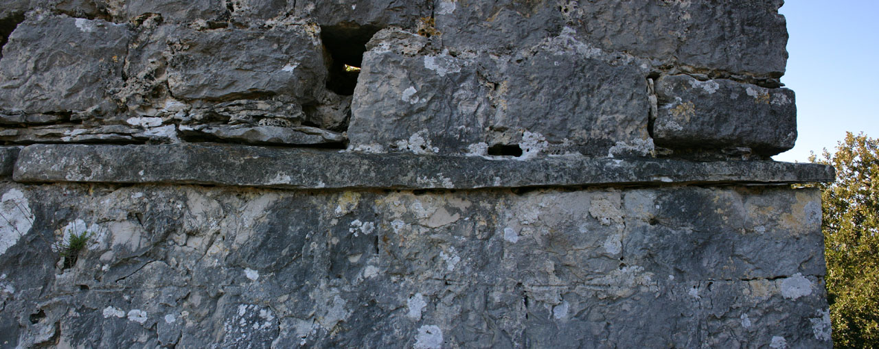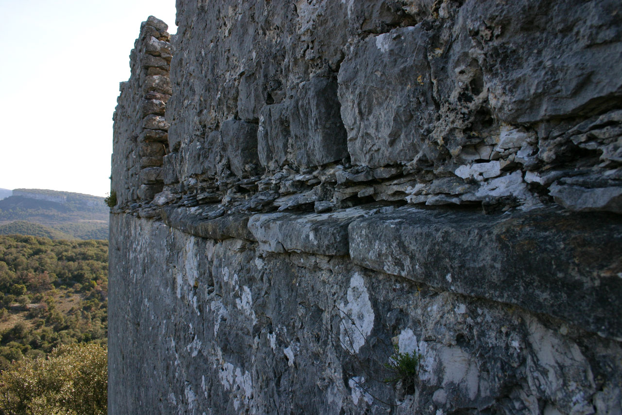 ⇑ Le mur a été posé directement sur les Lauzes du toit, les parties reconstruite sont beaucoup moins soignées que les parties originales.