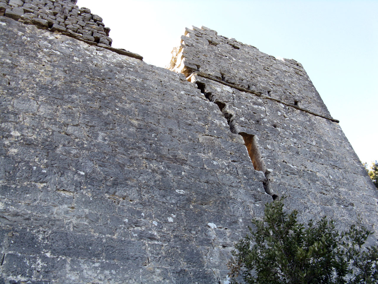 Le rocher support s'étant fracturé lors d'un séisme, d'inquiétantes fissures parcourent les murs ⇓