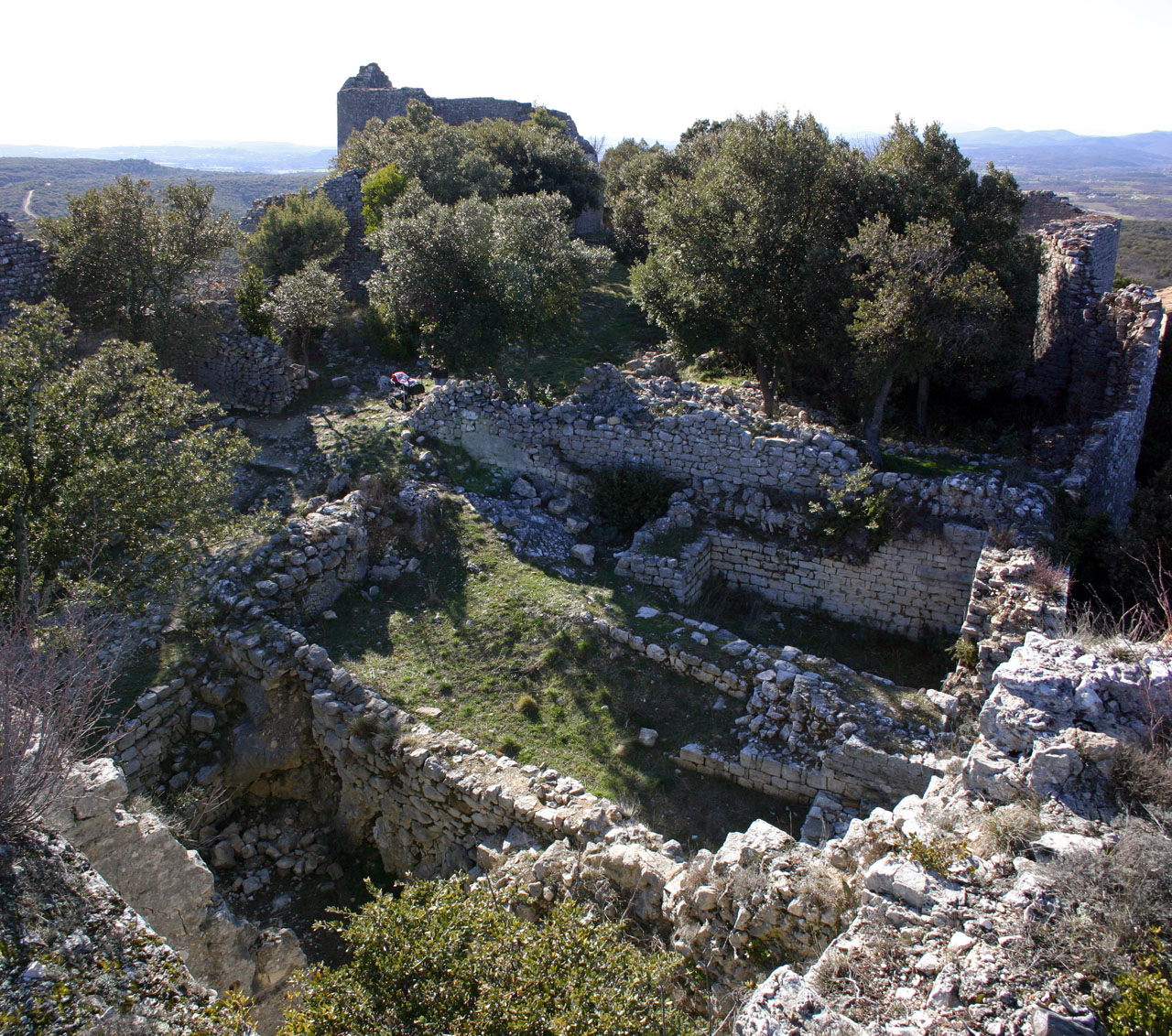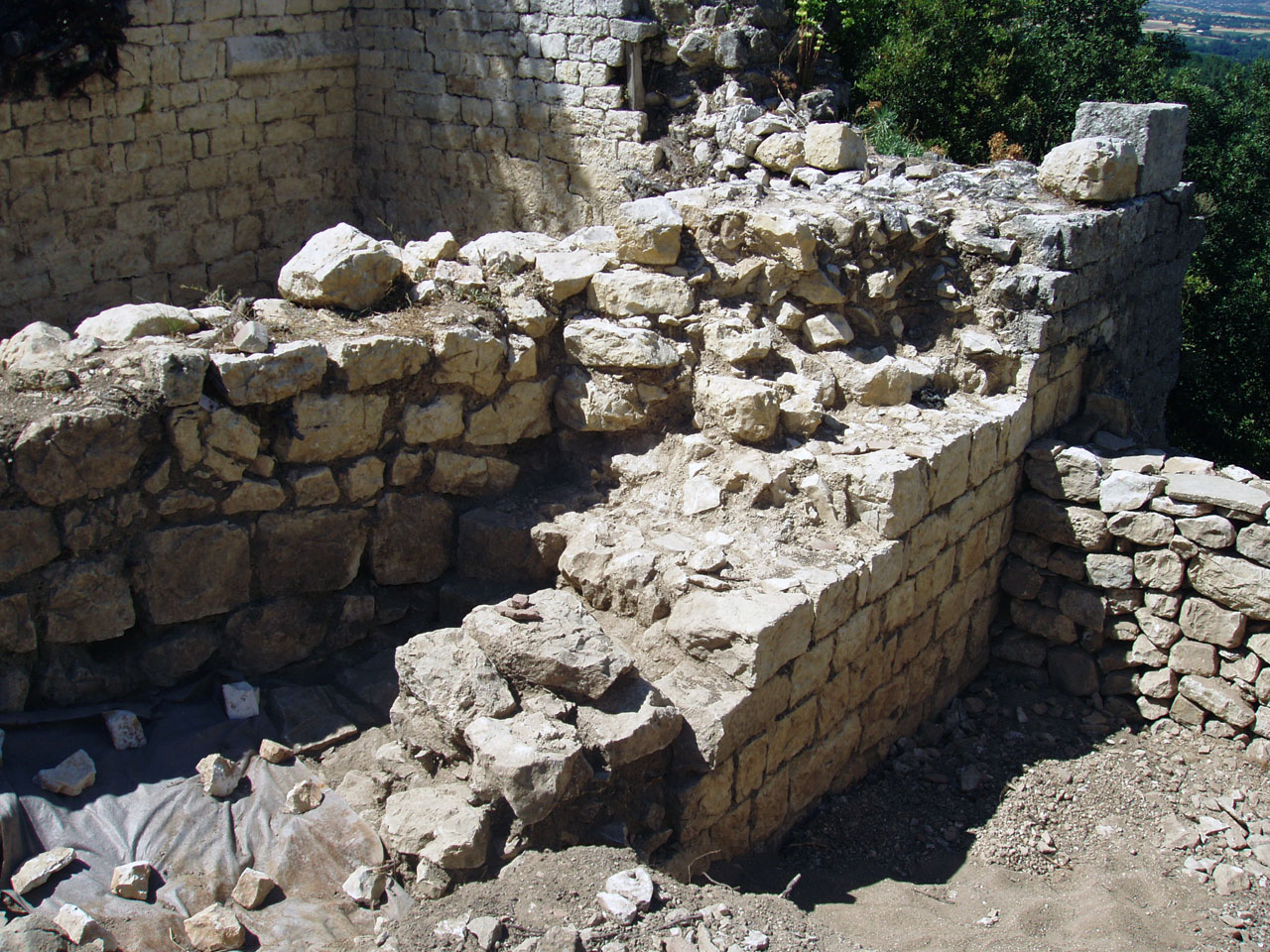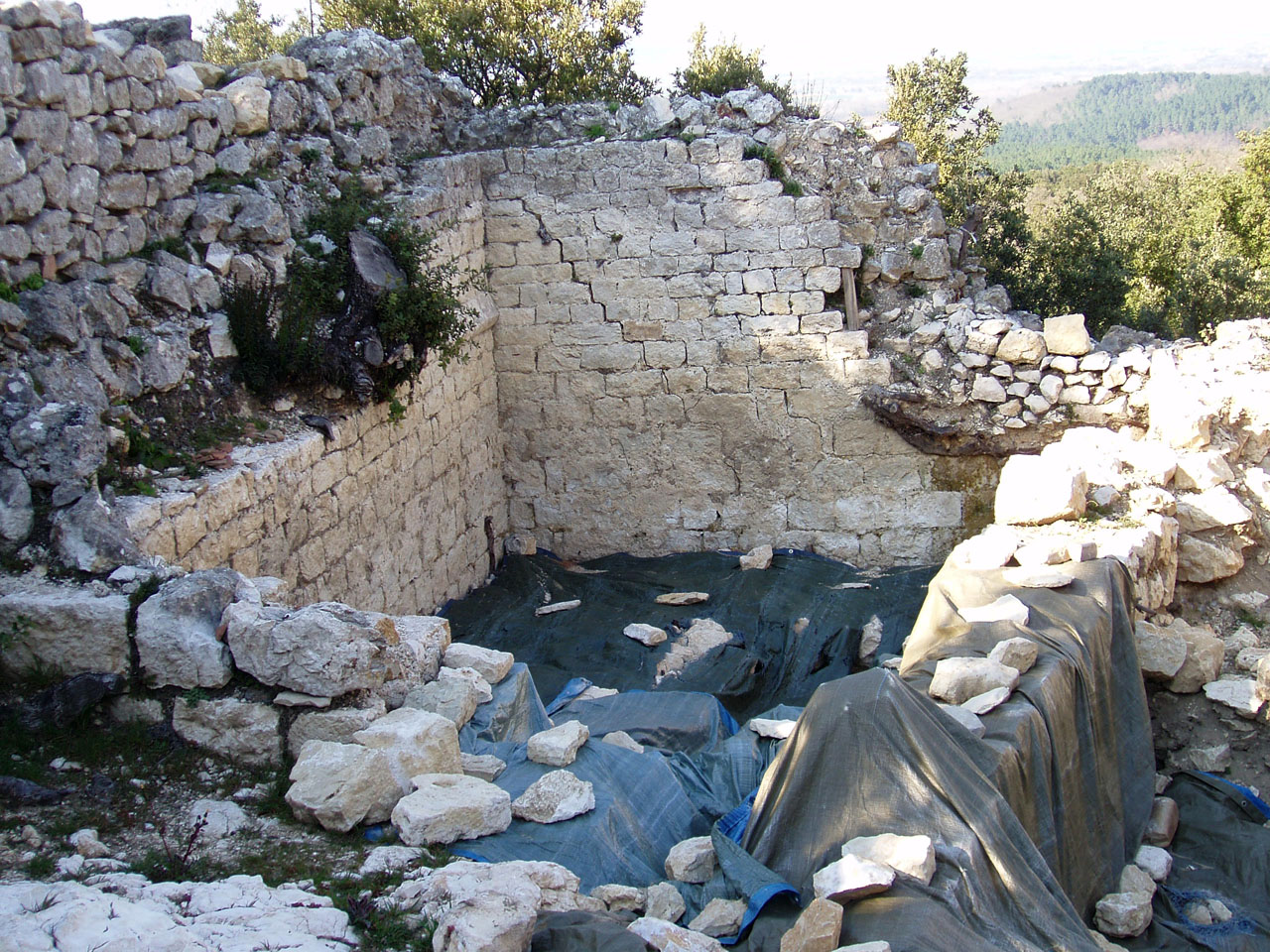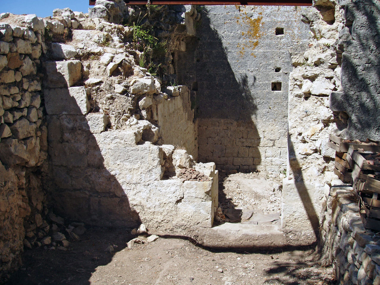 Vu de l'intérieur du château il ne reste plus que des traces des habitations de ce secteur: des fondations et quelques élévations de murs perpendiculaires à la façade Sud,les façades internes ayant totalement disparu: