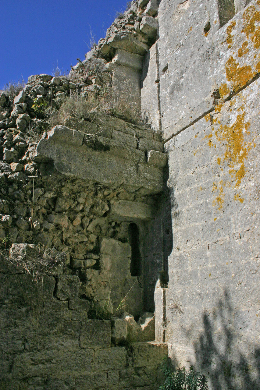 En haut, à gauche de cette dernière photo, se trouve un dispositif d'écoulement des eaux formé de deux tuiles romaines encastrées dans la maçonnerie, il s'agit de l'extrémité d'un canal en tuile situé dans l'épaisseur du mur latéral récupérant l'eau d'une toiture dont les "lauzes" sont prisonnières du mur ⇒