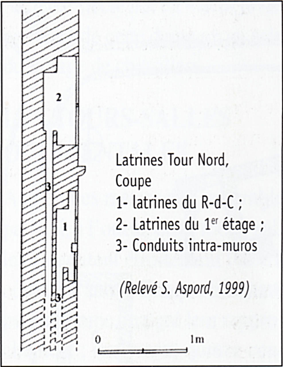 Cette tour présente une autre particularité remarquable heureusement épargnée par l'effondrement du mur ouest. En effet cette tour est équipée de latrines (équipement courant au XIIème siècle alors qu'il est absent des châteaux plus récents), ce qui est remarquable c'est la superposition de ces latrines (une pour chaque étage) avec chacune son conduit d'évacuation, regroupés en une sortie externe unique: